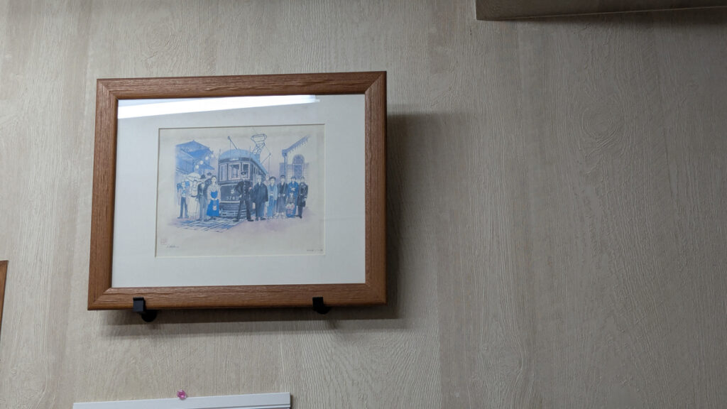 壁に路面電車の絵があって