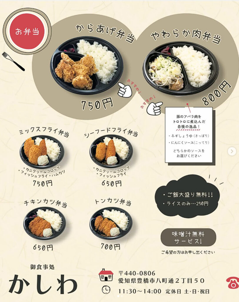 | ミックスフライ弁当 | 750円 |
